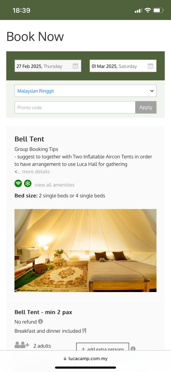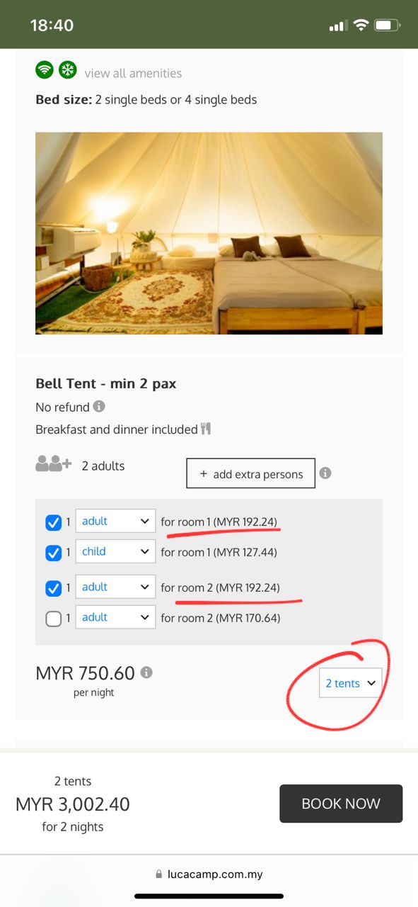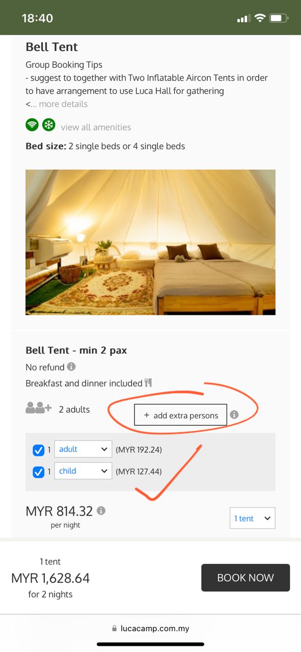 Kindly make booking in web:https://www.lucacamp.com.my/en/reservation