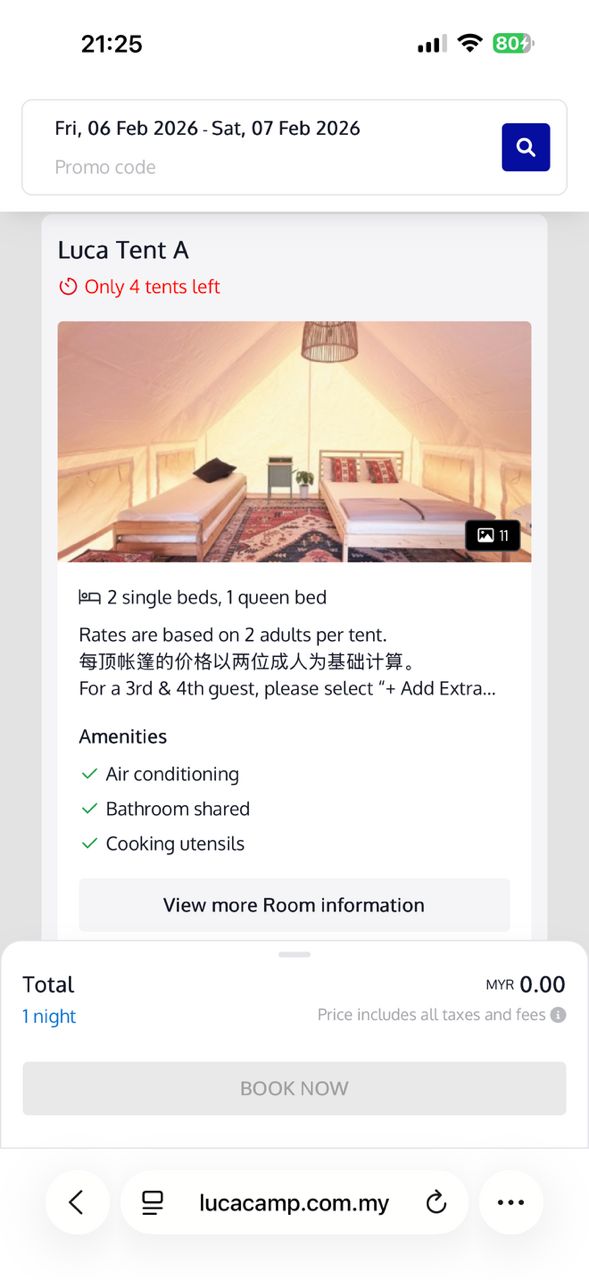 · Booking more than 3 tents: We recommend selecting Luca Pond Tent together with Luca Tent A/B to have access to the Luca Hall common area during your stay.